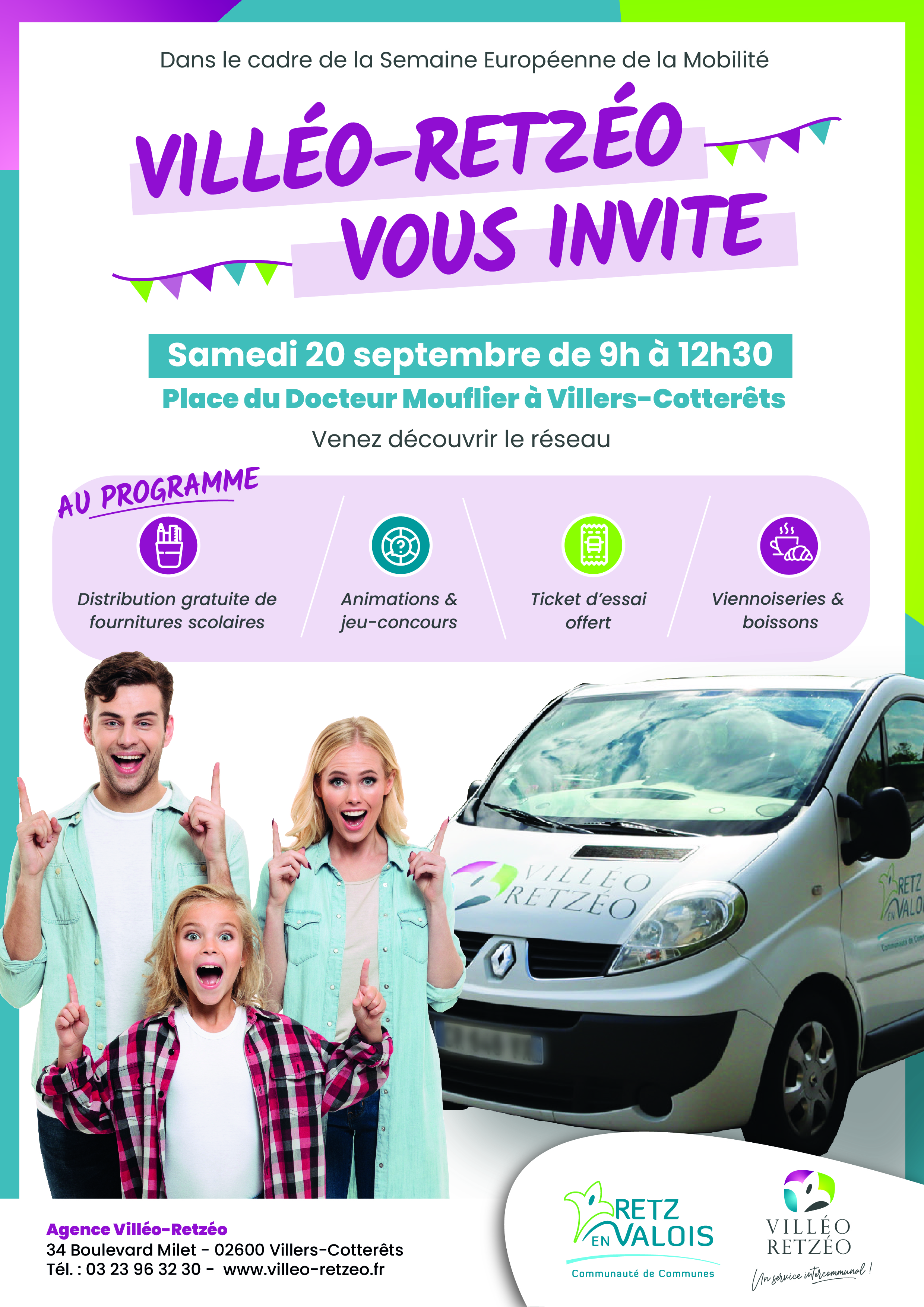 C'est la semaine Européenne de la mobilité ! Votre réseau Villéo-Retzéo vous donne rendez-vous samedi 20 septembre de 9h00 à 12h30, place du Docteur Mouflier, à Villers-Cotterêts, l'occasion idéale de nous rencontrer et de vous informer sur les horaires, trajets de votre réseau !
